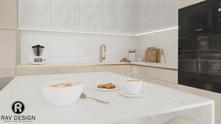 Wyspa kuchenna stanowi centralny punkt pomieszczenia, a białe hokery z złotymi nogami dodają wnętrzu szyku. Projekt RavDesign cechuje się dbałością o detale i wysoką jakością wizualizacji, prezentując funkcjonalną i estetycznie dopracowaną przestrzeń