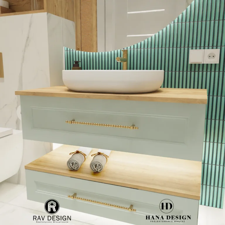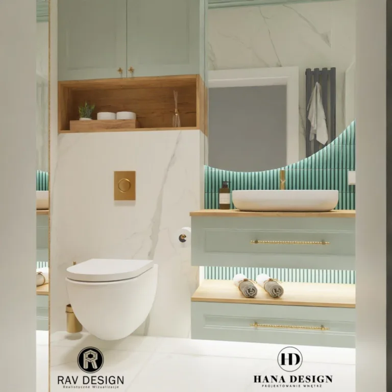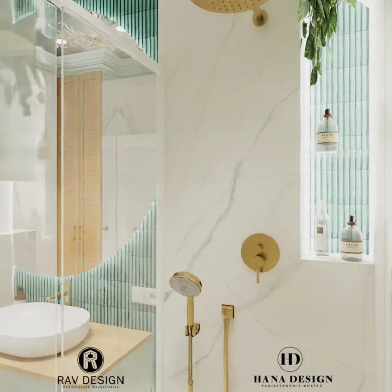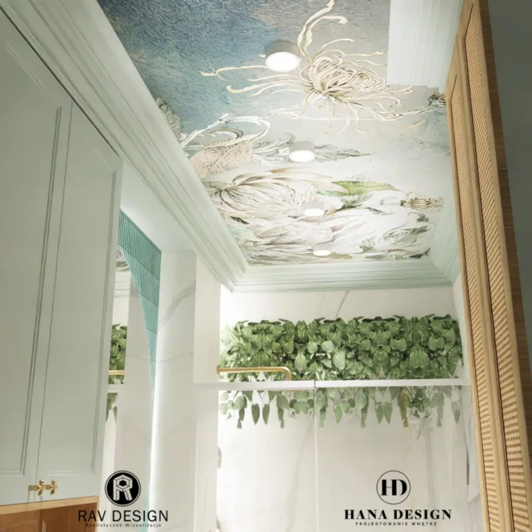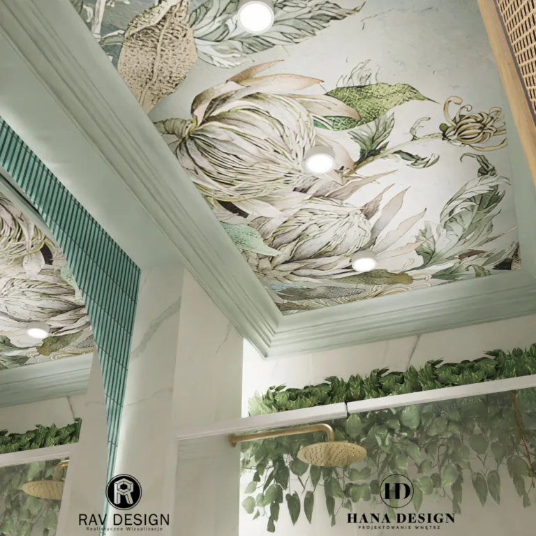 Po lewej stronie znajduje się toaleta i szafka wisząca. Po prawej – przestronna kabina walk-in ze złotą armaturą i roślinnymi akcentami. Oryginalny wzór na suficie i subtelne oświetlenie tworzą relaksującą atmosferę. Wizualizacja RavDesign wiernie oddaje założenia projektu HannaDesign.