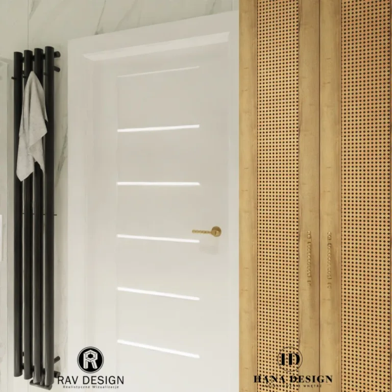 Prezentuje wizualizację nowoczesnej łazienki, na podstawie projektu HannaDesign. Wnętrze charakteryzuje się jasnymi kolorami i naturalnymi materiałami. Ściany wyłożone są wielkoformatowymi płytkami imitującymi biały marmur.